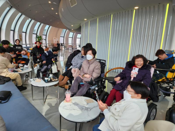 문화누리 자조모임-엑스포 한빛탑 최고관리자 뎃글수 0 조회수 2033 작성일 2023.02.27 2023년 첫 문화누리 자조모임이 2월 15일 엑스포 한빛탑 내에 있는 카페에서 진행됐습니다. 시설에 거주하는 회원 2명을 포함해서 총 8명의 회원들이 모인 가운데, 한 해 계획을 세웠습니다. 미리 생각해 온 의견들을 나누며, 한빛탑에서 대전 경치를 즐길 수 있었습니다. 회원들은 박물관, 가방 만들기, 지하상가 쇼핑, 오월드, 휴양림 방문 등 다채로운 활동을 하며 서로 친목도 쌓고 정보공유도 할 예정입니다. 문화누리 자조모임에 많은 관심 바랍니다.