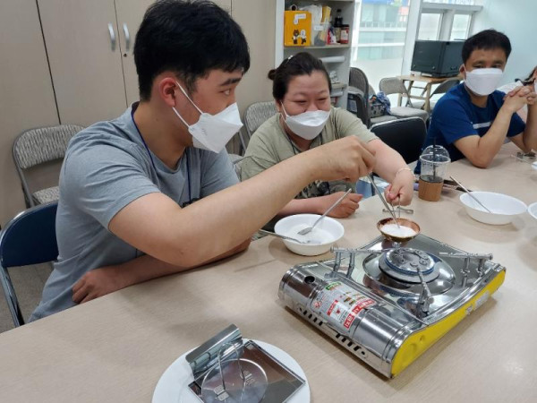 시나브로(한줄기) 최고관리자 뎃글수 0 조회수 2063 작성일 2022.08.01 재가 장애인과 시설 장애인 함께 짝꿍이 되어 진행하는 탈시설 프로그램 '시나브로' '한줄기' 시설 이용자 3명과 동료상담사 3명이 짝꿍이 되었습니다. 시설 이용자들이 하고 싶은 것들을 직접 선택해서 진행했는데요. 체험홈 영상 시청, 윷놀이, 커피만들기 체험, 아쿠아리움 관람, 달고나 만들기를 진행하며 버너 사용법도 익히고 짝꿍과 함께 추억도 쌓았습니다.