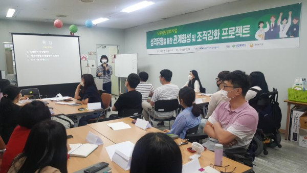 직원교육실시 오정미 뎃글수 0 조회수 2154 작성일 2020.06.30 2020.06.29(월) 13:30~17:30 센터 교육장에서 대전헬로스마일상담센터 엄영란 박사님을 모시고 “성격유형 분석을 통한 관계형성하기” 교육을 실시하였습니다. 직원 19명에 대하여 MBTI 성격유형검사를 실시하였고 기질별 특징을 알아보고 나와 너를 아는 시간을 가졌습니다. 교육을 통해 서로를 이해하고 격려하며 더욱더 조직을 강화시켜 장애인의 자립을 지원하는데 노력하겠습니다.
