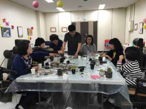 원예수업 조화액자 만들기 , 다육식물심기 서운지 뎃글수 0 조회수 1941 작성일 2018.04.23 4월 13일, 20일 금요일 한밭센터 교육장에서 원예수업 5강, 6강을 진행하였습니 다. 스칸디아모스 이끼로 액자를 만들었습니다. 색깔이 넘 이쁘고 창작품을 만드는 작업이 넘 진지하였습니다. 신기하기도 하고 이끼가 가습기 역할을 해서 실내 벽 장식으로 두면 좋을 것 같습니다. 또한 다육식물 정야와 크라 슐라(염좌) 심으며 다육식물의 특성들을 알 수 있었습니다.
