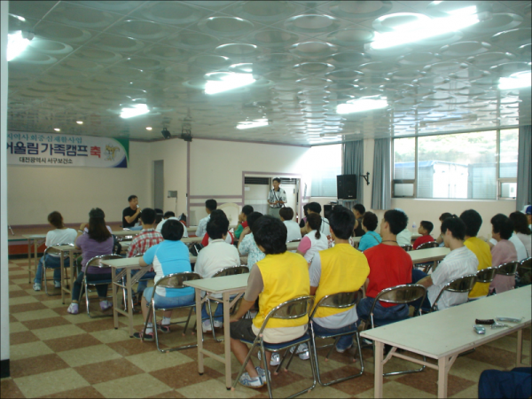 2005년 여름 가족 캠프 임지영 뎃글수 0 조회수 2195 작성일 2005.08.10 05. 7. 30-31일 공중유스호스텔에서 장애인과 가족들과 여름 캠프를 항였다. 캠프 첫날 프로그램하는 모습..........