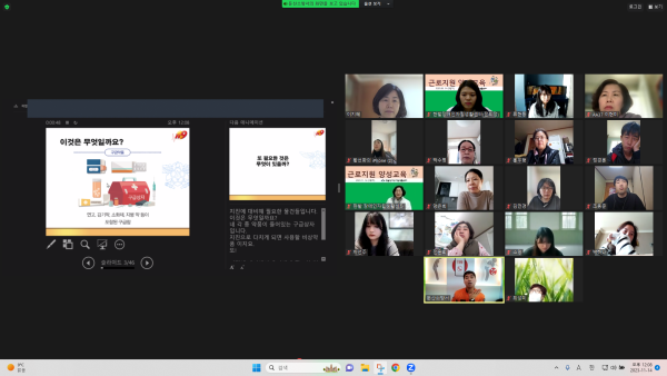 근로지원 양성교육 전의정 뎃글수 0 조회수 2111 작성일 2023.11.21 근로지원 양성교육이 9/19, 10/17(단축포함), 11/14 비대면(줌zoom)으로 진행되었습니다.일반 15명, 단축 36명으로 총 51명의 선생님께서 양성교육을 이수하셨습니다. 9/19은 오리엔테이션(1H), 장애인 자립생활(2H), 효과적인 의사소통(2H),직업재활 과정의 이해(2H), 정당한 편의 제공 및 보조공학의 이해(1H) 를 진행하였습니다. 10/17은 유관자격증을 보유한 36명을 포함하여 총 51명이 이수하였으며 장애인 인식개선(2H),근로지원서비스 실제(2H), 근로지원인 제도(2H), 근로기준법(2H)을 진행하였습니다. 11/14 장애유형별 심화교육(발달장애 이해)(2H),안전 및 인권교육(2H)을 진행하였습니다. 만족도 조사 결과 51명 49명이 교육일정에 만족하고, 2명은 보통이라고 응해주셨으며, 51명이 강사와 전반적 만족도에 만족하였으며, 관련 지식을 습득하는데 도움이 되었다는 답변을 주셨습니다. 교육을 이수하시느냐고 고생많으셨습니다. ^^ 앞으로도 만족하는 교육을 제공할 수 있도록 최선을 다하겠습니다.