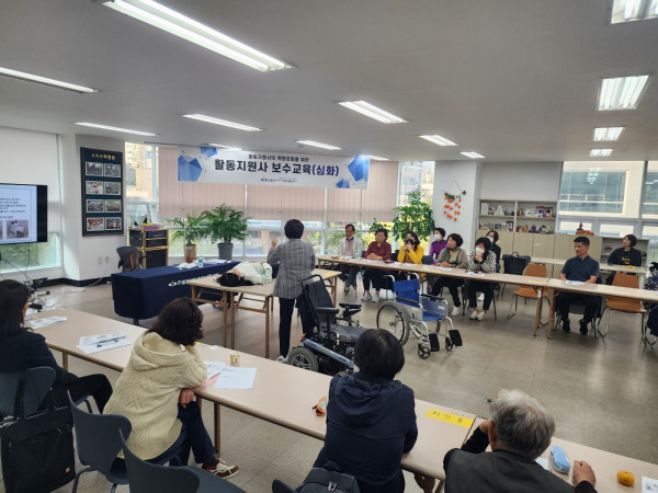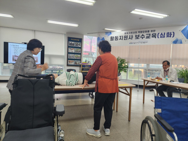 2023년 활동지원사 심화 보수교육 활동지원 뎃글수 0 조회수 1009 작성일 2023.10.31 2023년 10월 30일 14:30~16:30 활동지원사 심화보수교육이 진행되었습니다~ 23년도를 끝으로 한밭센터의 활동지원사 보수교육은 이번 교육이 마지막이네요! 바쁘신 와중에도 시간을 내어 교육에 참여해주신 선생님들을 위해 간식을 준비했습니다^^ 강의는 정신건강상담센터 소속, 배재대 간호학과 임상교수님이신 김보중선생님께서 강의를 진행해 주셨고, 총 33명의 선생님들께서 참석해주셨습니다 ^^ 이번 강의 주제는 신체장애인을 이해하고 올바른 서비스를 제공하는 법, 배뇨관 관리방법, 이용자 체위변경, 침대에서 휠체어 이동시 탑승방법등의 여러가지노하우를 배우는 강의를 준비 하였습니다. 체위변경 교육시에는 직접 선생님들이 배운것을 실습해보며 손쉽게 신체를 이동하는 법을 익히기도 했습니다 ~ 바쁘신 와중에도 참석해주신 활동지원 선생님들께 감사드리며, 내년에도 선생님들의 역량강화 및 전문성을 위해 한밭센터가 노력하겠습니다 ^^ 감사합니다.^^