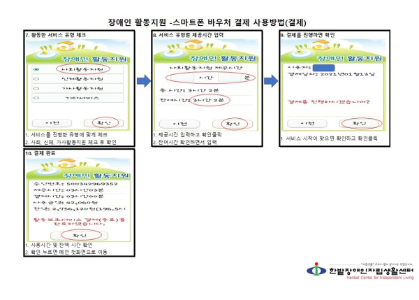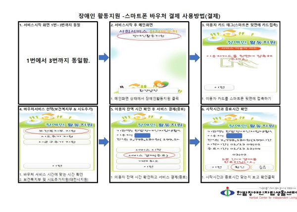 [활동지원] 스마트폰 결제 방법 설명서 이용문 뎃글수 0 조회수 732 작성일자 2021.04.09 장애인 활동지원 스마트폰 결제 방법 설명서 입니다. 결제 방법을 사진으로 작성하였으니 보시고 결제 하시기 바랍니다. 수고하세요.