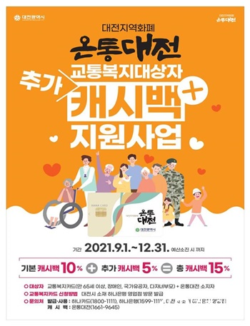 복지뉴스 HOME 커뮤니티 복지뉴스 공지사항 보도자료 캘린더 복지뉴스 백일장 전시회 복지뉴스 온통대전, 교통복지대상자에 최대 15% 캐시백 지급 최고관리자 뎃글수 0 조회수 1990 작성일자 2021.08.18 대전시는 9월부터 계층별 소비불균형을 완화하기 위해 온통대전 이용취약계층인 만 65세 이상, 장애인 등 교통복지 대상자에게 최대 15% 캐시백을 지급한다고 18일 밝혔다.[사진=대전시] 교통복지대상자 추가캐시백(이하 ‘교통복지 추가캐시백’)은 소비여력이 낮은 취약계층에게 추가 5%의 캐시백 지원을 통해 소비활동 지원과 함께 대중교통 이용을 활성화하기 위해 기획됐다. 시는 9월부터 교통복지카드 발급자가 온통대전으로 결제 시, 10%의 기본 캐시백에 5%의 추가 캐시백을 더해 총 15% 캐시백을 예산소진 시까지 지급한다는 방침이다. 추가 캐시백 지원대상은 주민등록상 대전시에 거주하는 만 65세 이상자, 장애인, 국가유공자, 다자녀 부모 중 교통복지카드를 발급한 온통대전 사용자이다. 이번 혜택은 교통복지카드와 온통대전을 발급받은 경우만 가능하다. 교통복지카드들 발급받지 않은 경우, 교통복지 대상임을 입증하는 서류를 지참하고 대전시 소재 하나은행 영업점을 직접 방문하면 된다. 카드발급 비용은 무료다. 발급ㆍ사용과 관련한 사항은 하나카드 콜센터(1800-1111), 하나은행 콜센터(1599-1111), 대전시 소재 하나은행 영업점으로. 캐시백과 관련한 사항은 온통대전 콜센터(1661-9645)로 문의하면 된다. 교통복지카드는 주민등록상 대전시에 거주하는 만 65세 이상자, 장애인, 국가유공자, 다자녀부모 등 무임승차 대상자들의 대전도시철도 이용편의를 위해 무임이용기능을 추가해 발급하는 교통카드다. 현재 발급대상자 30만 6천명 중 약 30%가 교통복지카드를 사용하고 있으며, 지난 7월 20일 온통대전과 교통복지카드를 결합한 통합카드가 출시됐다. 대전시는 온통대전-교통복지 통합카드(이하‘통합카드’) 이용 활성화를 위해 구 교통복지카드에서 통합카드로 전환하는 경우, 2천점의 하나머니를 지급할 계획이다. 대전시 고현덕 일자리경제국장은“9월부터 전통시장에서 온통대전을 사용할 경우 3% 추가 캐시백을 지급할 계획이며 교통복지카드를 발급받은 분들이 전통시장을 이용하면 총 18% 캐시백 혜택을 받을수 있다”고 말했다. 또한“교통복지카드를 발급받은 분들은 전통시장을 이용해 많은 혜택을 받으시고 교통복지카드를 발급하지 않은 분들은 가까운 하나은행에서 카드를 발급받아 추가 혜택을 받으시길 당부”했다. 한편 온통대전의 연령별 사용현황을 보면 40대, 50대, 30대 등 소비주도층이 전체 사용액의 60%를 차지하고 있다. 65세 이상은 평균 10% 미만으로 나타나 상대적으로 온통대전 혜택에서 소외되고 있는 것으로 나타났다. 이전 다음 목록