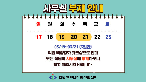 3/19~3/21사무실 부재 안내 활동지원 뎃글수 0 조회수 319 작성일자 2024.03.18 03/19~03/21 (3일간) 직원 역량강화 워크샵으로 인해 전직원이 사무실에 부재하오니 참고해주시길 바랍니다. ** 업무관련 문의사항은 아래 연락처로 전화주시길 바랍니다. ** • 활동지원팀 : 042-483-2373 • 근로지원팀 : 042-486-2373 • 자립생활지원팀 : 042-486-2373 • 평생교육문화센터 : 042-486-2371 • 발달장애인 주간활동 : 042-721-2373