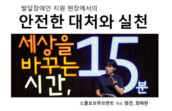 직원역량강화교육 박선희 뎃글수 0 조회수 2799 작성일 2023.11.03 □ 주제 : 발달장애인 지원 현장에서의 안전한 대처와 실천 □ 강사 : 스쿨오브무브먼트 대표 최하란, 정건 □ 일시 : 2023년 10월24일 15:00 ~ 17:00 □ 교육내용 1. 인간행동, 도전행동 이해하기 2. 안전한 대처와 실천 원리 파악하기 3. 안전한 대처와 실청 TIP 익히기 4. 안전한 경계 설정하기 5. 언어 테크닉 익히기 6. 안전한 대처와 실천을 위한 실습