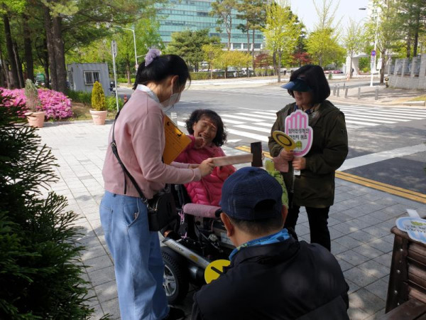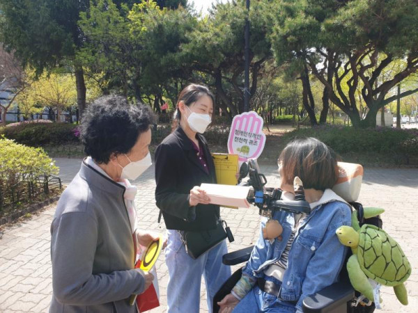 장애인식개선 캠페인(뇌병변장애) 김소희 뎃글수 0 조회수 2799 작성일 2023.04.20 2023년 4월 10일 부터 매주 월요일 오후 2시~4시, 장애인식개선 활동가들은 둔산동 일대에서 장애인식개선 캠페인을 진행하고 있습니다. 뇌병변 장애인 활동가들이 시민들이 고른 문제를 직접 읽고, 시민들이 O, X로 답을 하는 과정을 통해 느리지만 귀기울인다면 뇌병변 장애인과도 충분히 소통할 수 있음을 알리고 있습니다. 시민들의 응원에 힘입어 캠페인 활동은 계속될 예정입니다.