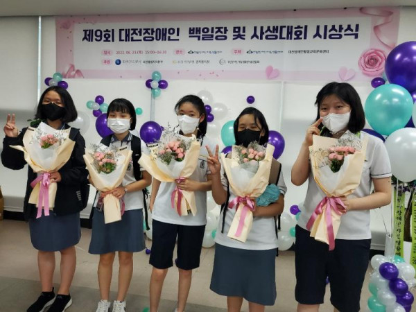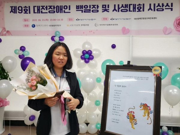 제9회 대전장애인 백일장 및 사생대회 시상식 진행 박상하 뎃글수 0 조회수 2960 작성일 2022.06.24 6월 23일 '제9회 대전장애인 백일장 및 사생대회' 시상식이 한밭센터 교육장에서 진행됐습니다. 코로나19로 인해 부대행사 없이 공모전 형태로 진행한 이번 대회에는 229명의 장애인이 ‘우리동네’, ‘호랑이’, ‘우주여행’을 주제로 미술과 문학작품을 출품했습니다. 오랜 심사 끝에 29명의 본상 수상자가 정해졌고, 코로나19 확산 예방을 위해 시상식은 본상 수상자 참석한 채 진행됐습니다. 참가대상자는 대전 관내 고등학교에 재학 중인 장애 학생과 성인 장애인으로, 문학과 미술로 분야를 나눠 진행했다. 고등부 교육감상을 포함한 14명 및 성인부를 포함해 총 29명에게 시상과 함께 상금이 수여됐다. 성인부 문학분야 대상을 수상한 박준희님은 “큰 상을 받게 되어 너무 기쁘고, 큰 자신감을 얻게 됐다. 이 자신감으로 더 좋은 글을 쓰도록 노력하겠다.”라고 수상소감을 밝혔다. 그 외 수상자에게는 각 학교 및 단체로 상장과 부상을 전달합니다. 다시 한번 수상하신 모든 분께 축하의 인사를 전합니다.