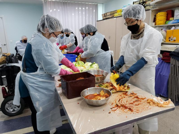 김장담그기 최고관리자 뎃글수 0 조회수 2663 작성일 2021.11.23 11월 13일 (목) 김장담그기 프로그램을 진행했습니다. 코로나 19바이러스의 확산세로 위생수칙과 방역수칙을 지키며 소수만 참여하였습니다. 맛있게 만든 김장김치는 방역용품과 함께 45가정에 전달됐습니다.
