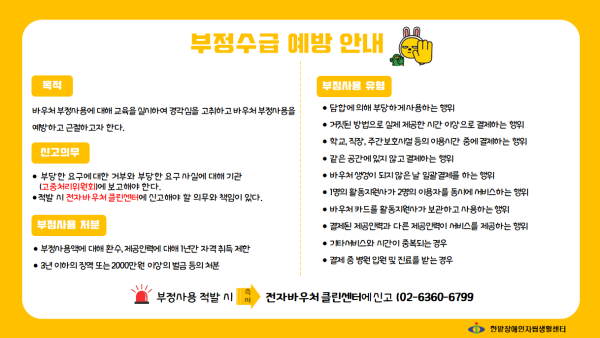 2020년 상반기 부정수급 예방 교육 최고관리자 뎃글수 0 조회수 2739 작성일 2020.05.11 ■ 목적 바우처 부정사용에 대해 교육을 실시하여 경각심을 고취하고 바우처 부정 사용을 예방하고 근절하고자 한다. ■ 교육내용 ▪ 신고 의무 - 부당한 요구에 대한 거부와 부당한 요구 사실에 대해 기관 (고충처리위원회)에 보고해야 한다. - 부정사용 적발 시 전자바우처 클린센터에 신고해야 할 의무와 책임이 있다. ▪ 부정사용의 유형 - 담합에 의해 부당하게 사용하는 행위 - 거짓된 방법으로 실제 제공한 시간 이상으로 결제하는 행위 - 학교, 직장, 주간보호시설 등의 이용시간 중에 결제하는 행위 - 같은 공간에 있지 않고 결제하는 행위 - 바우처 생성이 되지 않은 날 일괄결제를 하는 행위 - 1명의 활동지원사가 2명의 이용자를 동시에 서비스하는 행위 - 바우처 카드를 활동지원사가 보관하고 사용하는 행위 - 결제된 제공인력과 다른 제공인력이 서비스를 제공하는 행위 - 기타서비스와 시간이 중복되는 경우 - 결제 중 병원 입원 및 진료를 받는 경우 ▪ 부정사용의 처분 - 해당 지자체는 부정사용액에 대해 환수, 제공인력에 대해 1년간 자격 취득 제한 - 3년 이하의 징역 또는 2000만원 이상의 벌금 등의 처분