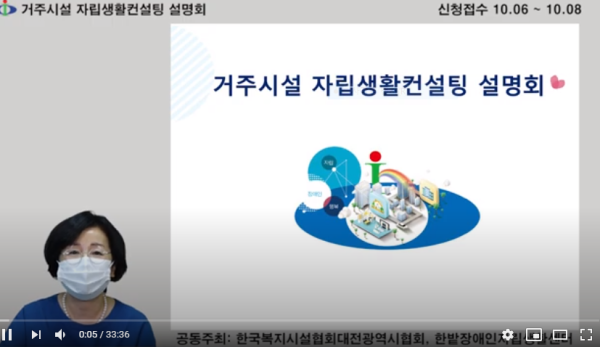 거주시설컨설팅 온라인 설명회 오정미 뎃글수 0 조회수 2677 작성일 2020.09.29 코로나 지속적인 확산으로 거주시설은 출입이 제한되어 자립에 대한 정보제공 및 사업연계가 어려운 상황입니다. 이에 거주시설컨설팅 사업을 홍보하고자 사전설명회를 동영상으로 촬영하게 되었습니다. 구성은 그동안 컨설턴트로 참여하셨던 목원대학교 김동기교수님과, 대전시설협회 유미원 원장님이 컨설팅 개요부터 진행방법, 거주시설 장애인의 자립적인 삶에 대해, 우리사랑 고영진 과장님으로부터 변화하는 우리사랑의 모습에 대한 내용을 담았습니다. 특히 올해부터는 대전시설협회와 공동으로 진행하게 되었으며, 시설협회를 통해 동영상 배포 및 접수를 받게 되어 많은 참여가 기대됩니다. <유튜브 영상보기> https://www.youtube.com/watch?v=LynO6TnTxzE&feature=youtu.be