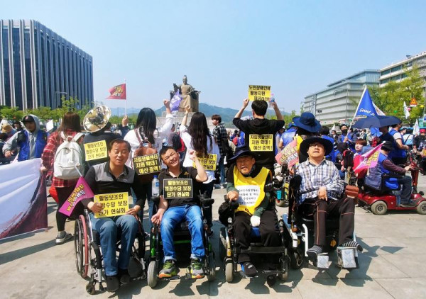 자립생활권리보장 궐기대회 송지은 뎃글수 0 조회수 2822 작성일 2018.04.26 4월25일 서울광화문광장에 전국에서 올라온 장애인들이 자립생활보장을 요구하는 궐기대회가 있었습니다. 한밭센터도 참여해 장애인의 자립생활 보장을 위한 복지법 개정과 자립생활센터 지원 확대, 활동지원 24시간 보장 및 수가현실화 요구에 힘들 보탰습니다.자립생활을 위한 제도 개선활동에 앞으로도 함께 하겠습니다. 투쟁!! 에이블뉴스 보도자료 http://m.ablenews.co.kr/News/NewsContent.aspx?CategoryCode=0028&NewsCode=002820180425160026644604