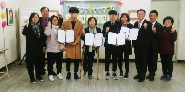 한밭센터후원회 장학금 전달식 오정미 뎃글수 0 조회수 2748 작성일 2018.03.16 [한밭센터후원회 장학금 지급 / 2018.03.16 ] 한밭센터후원회(회장 신재특)에서는 2018.3.16(금) 한밭센터교육장에서 장애인가 정 중.고등학생 4명에게 장학금을 전달하였습니다. 한밭센터후원회는 본 센터의 목적인 중증장애인의 자립생활 실현을 위해 후원자를 개발. 모금하여 다양한 사업 을 진행하고 있습니다. 장학금 지원은 올해가 처음이지만 앞으로 정식사업으로 매 년 학생들에게 가정의 소중함과 희망을 나누고, 부모들에게는 격려와 힘을 실어줄 수 있는 계기가 되기를 기대하며, 후원자로 함께 하길 원하시는 분들은 홈페이지(www.hbcil.or.kr)를 참고해주시기 바 랍니다.