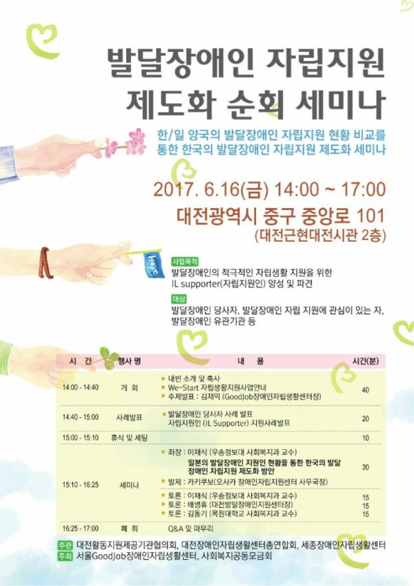 발달장애인 자립지원인 제도화를 위한 세미나 오정미 뎃글수 0 조회수 2901 작성일 2017.06.22 2017.6.16(금)14:00 대전 근대화전시관(구 충남도청) 2층 대강당에서 발달장애인 자립지원 제도화를 위한 자립지원인 양성 및 발달장애인 자립지원을 위한 진행과정을 함께 하였습니다. 또한 일본 오사카 자립생활센터 카키쿠보씨를 초빙하여 세미나를 실시하였습니다.
