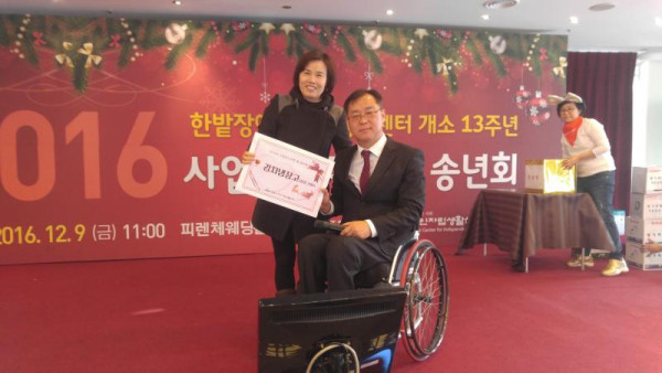 2016년 사업보고대회 및 송년회 김명석 뎃글수 0 조회수 3016 작성일 2016.12.19 12월 9일 제4회 한밭장애인자립생활의 날을 맞아 서구 월평동 패션월드 3층 피렌체웨딩홀에서 한밭장애인자립생활센터 개소 13주년 기념 2016년 사업보고대회 및 송년회를 개최하였습니다. 이날 행사는 장애인과 활동보조인, 지역 관계자 300여명이 참석한 가운데 2016년 사업보고를 시작으로, 중증장애인의 자립생활을 위해 많은 노력을 한 분들에 대한 시상과 감사패 전달, 장기자랑, 경품 추첨 등 즐거운 교류의 시간으로 진행되었습니다. 올해 자립생활대상은 장애인당사자 이갈렙, 활동보조인 정정숙님이 수상하였고, 장애인의 삶을 질을 높이는데 큰 힘이 되어준 활동지원 종사자들을 격려하는 서구청장상은 활동보조인 신미영, 이미화, 하은옥, 한명심님이 수상하였으며, 난관을 극복하고 자립생활을 실현한 장애인 당사자 유경화, 박진희, 이태원, 김명석님에게 서구의회의장상이 수여됐습니다. 왕성한 사회활동으로 자립생활을 하고 있는 장애인과 그를 위해 노력하고 있는 활동보조인에게 수여한 박병석 국회의원상은 장석란, 김선경님, 박범계 국회의원상은 백승미, 이래용님이 수상했습니다. 마지막으로 헌신적인 봉사와 나눔으로 자립생활을 지원한 애듀비전 박춘자대표님과 서대전네거리역 이충선역장님에게 감사패를 전달했습니다. 이어 중증장애인 엄일섭님이 ‘즐거운 나의 집’과 ‘사랑으로’를 코보드연주(코로 키보드를 연주)하여 시상식에 상을 수여한 분들과, 비록 상을 받지 못했지만 수상자 못지않게 수고한 모든 분들을 축하하고 격려하는 감동의 시간을 가졌습니다. 시상식 및 점심식사에 이어 오후에는 2016년 한 해 동안 열심히 활동해주신 이용자와 활동보조인이 같이하는 즐거운 장기자랑과 경품추첨 한마당이 이어졌습니다. 이때에는 특별공연으로 문화센터 회원 20여명이 멋진 율동과 노래로 흥을 북돋았으며, 장기자랑은 이용자 및 활동보조인 가운데 총 10팀이 출전하여 그동안 감추어 두었던 재능들을 맘껏 펼치며 모두가 함께 하는 즐거운 시간을 보냈습니다.