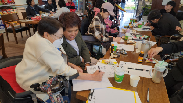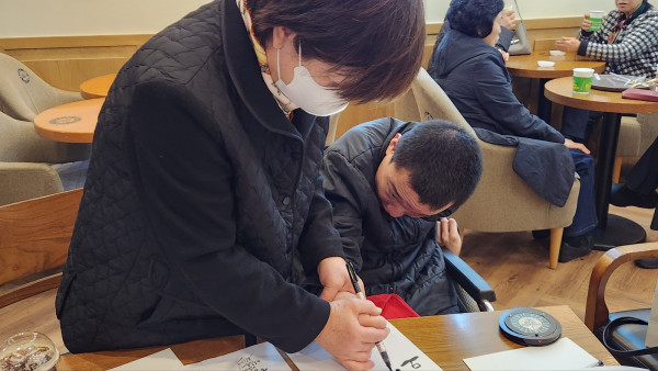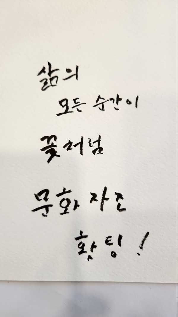 자조모임-문화누리 4월 모임 김소희 뎃글수 0 조회수 2720 작성일 2024.04.11 지난 4월 6일 수요일, 문화누리 회원들은 비가 와서 벚꽃놀이 대신 화폐박물관 카페에서 캘리그라피 체험을 했어요~ '삶의 모든 순간이 꽃처럼 문화 자조 홧팅!' 너무 아름다운 글이에요~ 화폐박물관 1층에서 진행중인 꽃꽂이 포토존에서 사진도 찍구요~ 1층 로비에서 사진도 찍으며 추억을 남겼습니다~ 비가 와서 더 운치있네요~ 문화누리 회원들은 5월에 기차 여행을 갈 예정입니다~