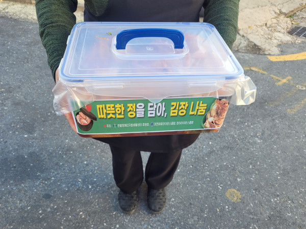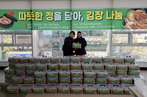2023년 김장김치 후원 행사 한밭 뎃글수 0 조회수 1768 작성일 2023.11.23 찬 바람이 부는 11월, 김장철을 맞이하여 대전 태광 라이온스클럽의 후원을 받아 한밭센터 직원들과 후원회 분들이 힘을 합쳐 김치를 만들었습니다. 뿐만 아니라 발달장애인들이 직접 김치 만들기 체험을 해보는 시간을 가졌습니다. 이번 김장은 총 400포기의 김치를 담았고 200여명의 이용자에게 따뜻한 마음을 담아 김치를 전달했습니다. 맛있게 드시고 행복한 겨울 나시길 바랍니다. ❤️ 이번 행사로 고생하신 한밭센터 직원들과 후원회 분들께도 감사드립니다.