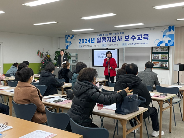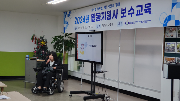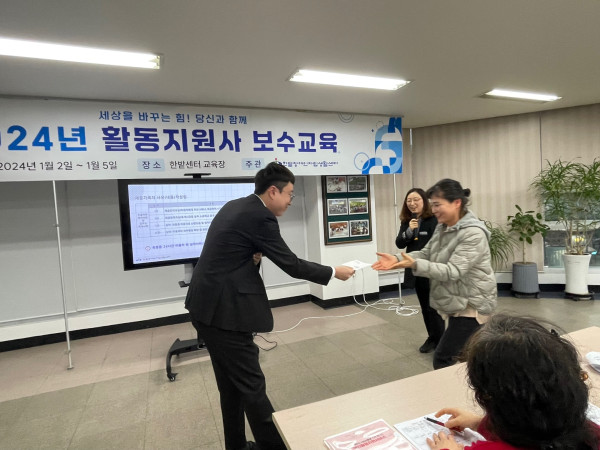 2024년 1월 보수교육 진행사진 활동지원 뎃글수 0 조회수 1612 작성일 2024.01.11 2024년 새해가 밝았습니다. 새해 복 많이 받으세요~~ 활동지원팀은 2024년의 시작을 활동지원사 보수교육으로 시작했습니다. 1.2 ~ 1.5까지 4일간 총8회차를 진행하였고 380명의 활동지원사가 참석하셨습니다. 선생님들이 오시기 전 접수대와 교육장을 미리 준비합니다. 4일간 진행하는 교육일정으로 인사말은 센터장님과 국님께서 시간을 나누어 해주셨습니다. 이번엔 조한비, 권은영, 홍동일사회복지사가 교육을 진행하였습니다. 긴장되는 마음으로 열심히 준비를 하였답니다.^^ 교육도 좋지만 ㅎㅎ 집중도를 높이고 피곤한 눈을 번쩍 뜨게 하는 퀴즈있어야겠죠??^^ 교육을 마친 후에는 저희가 준비한 간식과 한밭후원회에서 후원해준 수건을 나눠 드렸습니다. 선생님들의 적극적인 참여와 협조로 1월 활동지원사 보수교육을 무사히 마칠 수 있었습니다. 다시한번 감사드리며, 올해에 진행되는 보수교육에 많은 관심과 참여부탁드립니다.