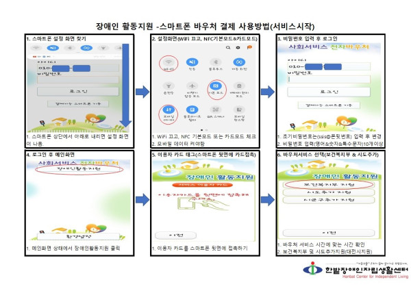 [활동지원] 스마트폰 결제 방법 설명서 이용문 뎃글수 0 조회수 1017 작성일자 2021.04.09 장애인 활동지원 스마트폰 결제 방법 설명서 입니다. 결제 방법을 사진으로 작성하였으니 보시고 결제 하시기 바랍니다. 수고하세요.