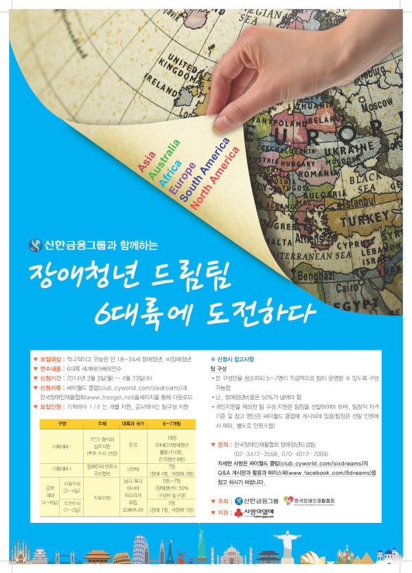 장애청년드림팀 10기 모집합니다. 최고관리자 뎃글수 0 조회수 1606 작성일자 2014.03.14 [온라인총괄부] 장애∙비장애 청년들이 세계를 향해 꿈을 펼칠 수 있는 특별한 해외연수가 실시된다. 바로 ‘2014 장애청년드림팀 6대륙에 도전하다’가 그 주인공이다. ‘장애청년드림팀 6대륙에 도전하다’는 미래사회를 이끌어갈 적극적이고 유능한 장애∙비장애 청년을 국제사회 리더로 성장할 수 있도록 역량강화와 사회적 참여를 제공하는 종합연수프로그램으로 현재 10기 드림팀 신청자를 모집하고 있다. 올해 드림팀은 6대륙 7개 팀 총 66명의 학생들의 활약을 기대하고 있다. 이들은 기획테마 2개 팀과 공모테마 5개 팀을 중심으로 ‘Creating the world together’라는 주제로 해외연수에 참여하게 된다. 기획테마는 장애인의 빈곤과 국제협력이라는 지정과제를 수행하거나 TED 형식의 심포지엄을 진행하고, 공모테마는 자유주제와 도전주제로 나뉘어 남미, 북미, 아시아, 아프리카, 유럽, 오세아니아를 탐방하며 공모전 형식의 주제를 완수하게 된다.서류 접수 기간은 오는 4월 23일까지로 적극적이고 유능한 만 18~34세 장애청년, 비장애청년이라면 참여가 가능하다. 오는 12일에는 전남대학교, 13일에는 충남대학교에서 드림팀과 관련한 사업설명회가 진행될 예정이다. 사업설명회에서는 2014년 연수에 대한 소개와 드림팀에 참가했던 선배 참가자(드림홀릭OB)를 만날 수 있는 시간이 마련된다. 이번 공모전을 주최한 한국장애인재활협회 관계자는 “올해 해외연수는 배우는 연수에서 기여하는 연수로 발전시키고자 장애인의 빈곤과 국제협력이라는 지정과제를 수행하는 등 10주년을 맞아 예년보다 더욱 다채로운 행사를 준비하고 있다”며 “많은 청년들의 관심과 참여를 부탁하다”고 말했다.장애청년드림팀 6대륙에 도전하다 해외연수는 한국장애인재활협회(회장 이상철)와 신한금융그룹(회장 한동우)이 주최하고 외교부, 사회복지공동모금회가 후원 및 지원한다. 드림팀 신청에 대한 자세한 사항은 홈페이지(www.freeget.net)에서 확인할 수 있다. XML