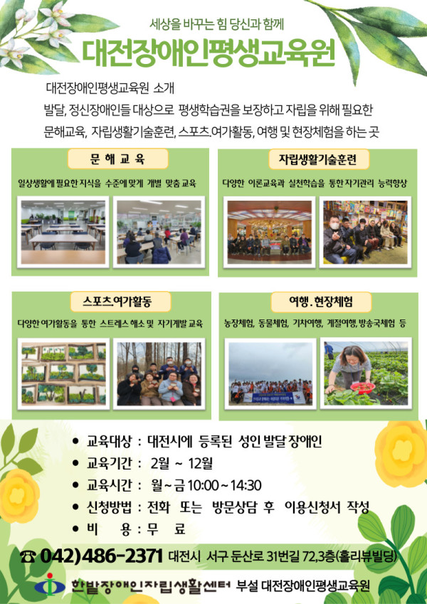 공지사항 HOME 커뮤니티 공지사항 공지사항 보도자료 한밭영상 캘린더 복지뉴스 백일장 전시회 공지사항 대전장애인평생교육원 평생교육 뎃글수 0 조회수 680 작성일자 2024.04.11 많은참여와 관심 부탁드립니다. 이전 다음 목록