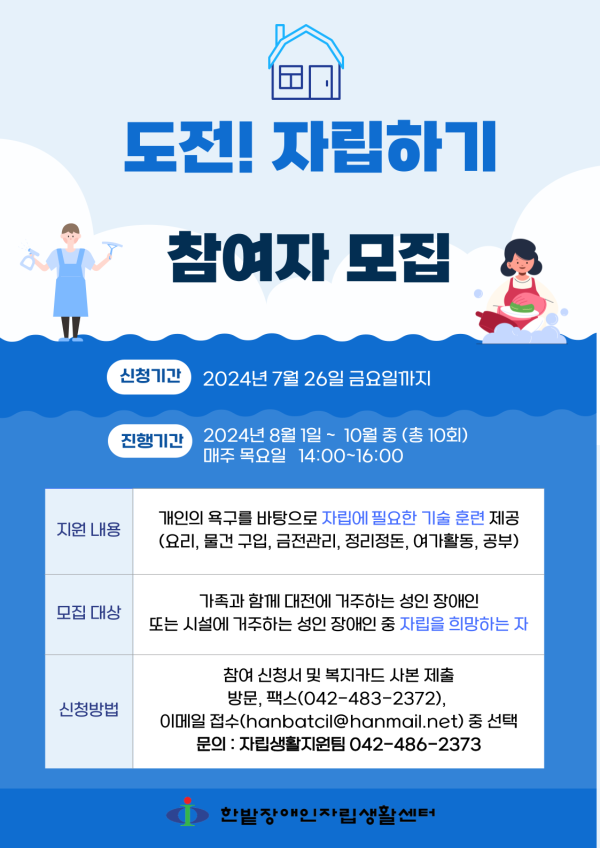 하반기 도전! 자립하기 프로그램 참여자 모집 안내 최고관리자 뎃글수 0 조회수 1715 작성일자 2024.06.21 2024.07.30 16:00첨부파일 다운로드도전 자립하기 참여 신청서.hwp (16.0K) + 583 도전! 자립하기(도자기) -지원내용 : 개인의 욕구를 바탕으로 자립에 필요한 기술 훈련 제공 (요리, 물건 구입, 금전관리, 정리정돈, 여가활동, 공부) -모집대상 : 가족과 함께 대전에 거주하는 성인 장애인 또는 시설에 거주하는 성인 장애인 중 자립을 희망하는 자 -진행일정 : 8월 1일 ~ 10월 중순 매주 목요일 오후 2시~4시(10회) -모집기간 : 2024년 7월 26일까지 -신청방법 : 참여 신청서 및 복지카드 사본 제출 방문 또는 팩스(042-483-2372) 또는 이메일 접수(hanbatcil@hanmail.net) -문의 : 자립생활지원팀 042-486-2373 [이 게시물은 최고관리자님에 의해 2025-02-19 11:57:31 공지사항1에서 복사 됨]