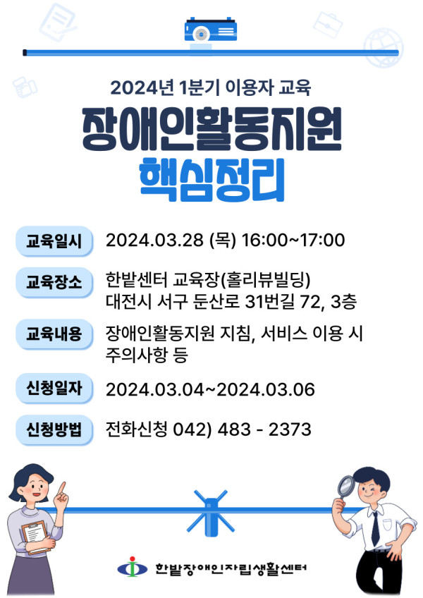 2024년 1분기 이용자 교육 안내 활동지원 뎃글수 0 조회수 645 작성일자 2024.02.27 본 센터에서는 장애인활동지원 서비스를 이용하는 이용자 및 보호자를 대상으로 소규모 집합 교육을 실시하고자 합니다. • 교육일시 : 2024.03.28 (목) 16:00~17:00 • 교육장소 : 한밭센터 교육장(홀리뷰빌딩 3층) • 교육내용 : 장애인활동지원 지침, 바우처 카드 관리 및 사용 시 주의 사항, 부정 수급 유형 안내, 활동지원인력에 대한 성희롱 등 유의사항• 신청일자 : 2024.03.04 ~ 2024.03.06 • 신청방법 : 전화접수 042-483-2373 많은 관심과 참여 부탁드립니다❤️