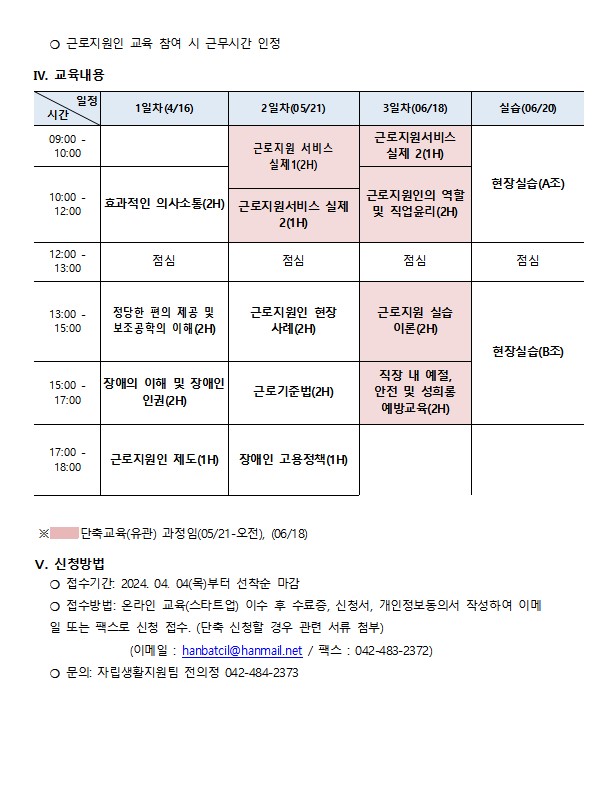 2024년 근로지원인 양성교육 안내 전의정 분류 notice 뎃글수 0 조회수 1986 작성일자 2024.04.01 2024.07.08 12:41첨부파일 다운로드근로지원 양성교육 필요서류.pdf (94.6K) + 535 신청기간은 2024.04.04일부터 진행됩니다. 선착순으로 진행될 예정입니다. 추후 교육내용이 변경될 수 있음을 안내드립니다. [이 게시물은 최고관리자님에 의해 2025-02-19 11:57:18 공지사항1에서 복사 됨]