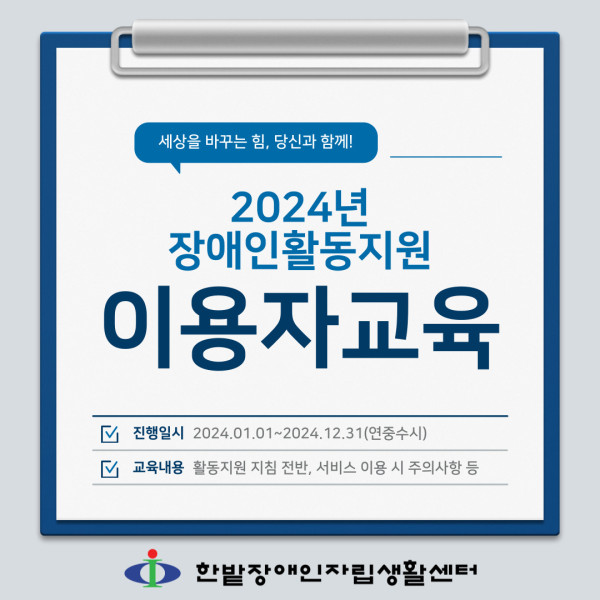 2024년 장애인활동지원 이용자 교육 안내 최고관리자 분류 notice 뎃글수 0 조회수 1732 작성일자 2024.01.09 2024.07.08 12:41첨부파일 다운로드2023-이용자 교육 안내문.pdf (995.6K) + 567 • 사 업 명 : 2024년 장애인활동지원 이용자 교육 • 사업일시 : 2024.01.01 ~ 2024.12.31 (연중수시) • 사업대상 : 본 센터 장애인활동지원 서비스를 이용하는 이용자 및 보호자 • 사업내용 : 장애인활동지원 지침, 서비스 이용 시 주의사항 등 교육 진행 시 적극적으로 참여해주시기 바랍니다. [이 게시물은 최고관리자님에 의해 2025-02-19 11:56:37 공지사항1에서 복사 됨]