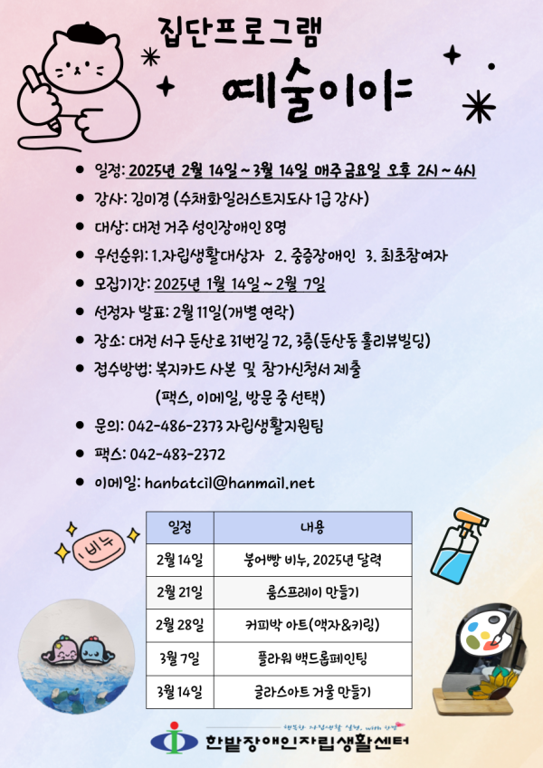 집단프로그램 '예술이야' 참여자 모집 안내 김소희 뎃글수 0 조회수 1285 작성일자 2025.01.13 2025.01.13 15:33첨부파일 다운로드참여신청서.hwp (15.5K) + 462 -일정: 2025년 2월 14일 ~ 3월 14일 매주 금요일 오후 2시~4시 -강사: 김미경(수채화일러스트지도사 1급 강사) -대상: 대전 거주 성인장애인 8명 -우선순위: 1. 자립생활대상자 2. 중증장애인 3. 최초참여자 -모집기간: 2025년 1월 14일 ~ 2월 7일 -선정자발표: 2월 11일(개별 연락) -장소: 대전 서구 둔산로 31번길 72, 3층(둔산동 홀리뷰빌딩) -접수방법: 복지카드 사본 및 참가신청서 제출 (팩스, 이메일, 방문 중 선택) -문의: 042-486-2373 자립생활지원팀 -팩스: 042-483-2372 -이메일: hanbatcil@hanmail.net 일정 내용 2월 14일 붕어빵 비누, 2025년 달력 2월 21일 룸스프레이 만들기 2월 28일 커피박 아트(액자&키링) 3월 7일 플라워백드롭 페인팅 3월 14일 글라스아트 거울 만들기 [이 게시물은 최고관리자님에 의해 2025-02-19 11:58:03 공지사항1에서 복사 됨]