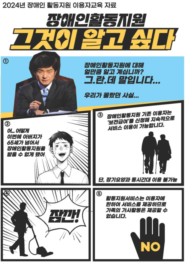 2024년 장애인활동지원 이용자 교육(집합) 안내 활동지원 뎃글수 0 조회수 707 작성일자 2024.10.10 2024.10.18 11:14첨부파일 다운로드2024_이용자-교육_집합.pdf (1.6M) + 555 본 센터에서는 장애인활동지원 서비스를 이용하는 이용자 및 보호자를 대상으로 집합 교육을 실시하고자 합니다. *교육일시: 2024.10.17(목) *교육장소: 경상남도 함양 (상림공원) *교육내용: 신고의무사항, 부정 사용 예방수칙, 본인부담금, 급여 중단 사유, 서비스 이용 범위 및 확인, 서비스 이용 시 주의사항, 서비스 요구 방법 등 많은 관심과 참여 부탁드립니다.